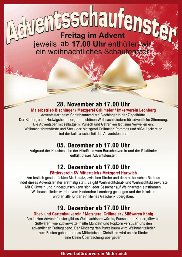 Weiter geht es am Freitag, 12. Dezember, mit dem Adventsfenster am Kirchplatz, organisiert vom Förderverein des SV Mitterteich.