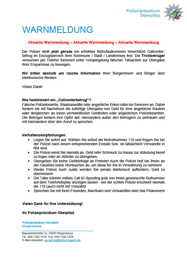 Aktuell kommt es im Landkreis Tirschenreuth vermehrt zu Anrufen durch Enkeltrick- und Callcenterbetrüger.