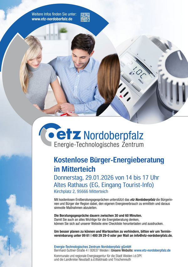 Das Energie-Technologische Zentrum Nordoberpfalz (etz Nordoberpfalz) bietet am Donnerstag, 29.01.2026 von 14:00 Uhr bis 17:00 Uhr im Alten Rathaus der Stadt Mitterteich, Kirchplatz 2 (Eingang Tourist-Info) eine KOSTENLOSE Energieberatung zum Thema Energieeffizienz an. Ein/e Berater/in des Energie-Technologischen Zentrums Nordoberpfalz unterstützt bei Fragen rund um den eigenen Energieverbrauch, energieeffiziente Sanierung, Energiesparmaßnahmen und Fördermöglichkeiten. Eine Anmeldung ist unbedingt telefonisch (0961|4802929-0) oder per Mail (info@etz-nordoberpfalz.de) erforderlich. Informationen sowie Angaben über mitzubringende Unterlagen finden Sie auf www.etz-nordoberpfalz.de.
