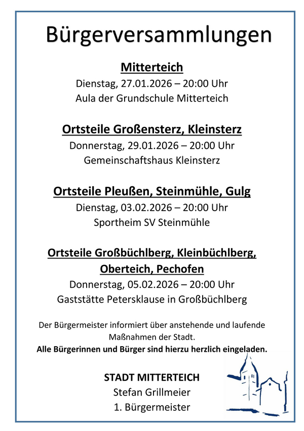 Die Stadt Mitterteich lädt recht herzlich zu den Bürgerversammlungen ein.
