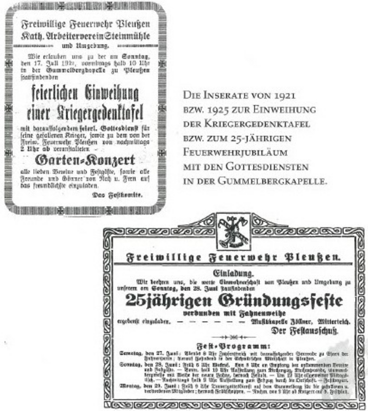 ...Schon längst war es der sehnlichste Wunsch der Freiwilligen Feuerwehr Pleußen, ihren gefallenen und im Felde verstorbenen Mitgliedern eine Heimatgrabstätte zu widmen, in der Form einer Kriegergedenktafel. Da sich nun der kath. Arbeiterverein Steinmühle und Umgebung mit anschloss und auch von Seiten des gesamten Gemeinderates Pleußen dieses edle Werk vollste Unterstützung fand, ist es gelungen, dieses schöne und ewige Andenken, wenngleich mit großem Kostenaufwand verbunden, zu vollenden. Es findet daher am Sonntag, den 17. Juli (1921) vormittags halb zehn in der Gummelberg-Kapelle zu Pleußen unseren gefallenen Helden, Mitgliedern und Gemeindebürgern zu Ehren die feierliche Einweihung dieser Kriegergedenktafel mit darauffolgendem feierlichen Gottesdienste statt. Die beiden festgebenden Vereine sowie der Gemeinderat und die ganze Einwohnerschaft von Pleußen werden alles aufbieten, den gesamten hierzu geladenen Vereinen und Festgästen, die durch ihr Erscheinen das Fest verherrlichen helfen, durch Schmücken und Dekorieren des Ortes und des Kirchleins das Verweilen im Orte und beim Feste recht angenehm zu machen. Damit auch für Unterhaltung gesorgt ist wird von der Freiwilligen Feuerwehr Pleußen von nachmittags zwei Uhr ab ein Gartenkonzert veranstaltet, welches (durch) die verstärkte Musikkapelle Zeitler aus Mitterteich, die auch zur vormittäglichen kirchlichen Feier spielt, ausgeführt wird ...