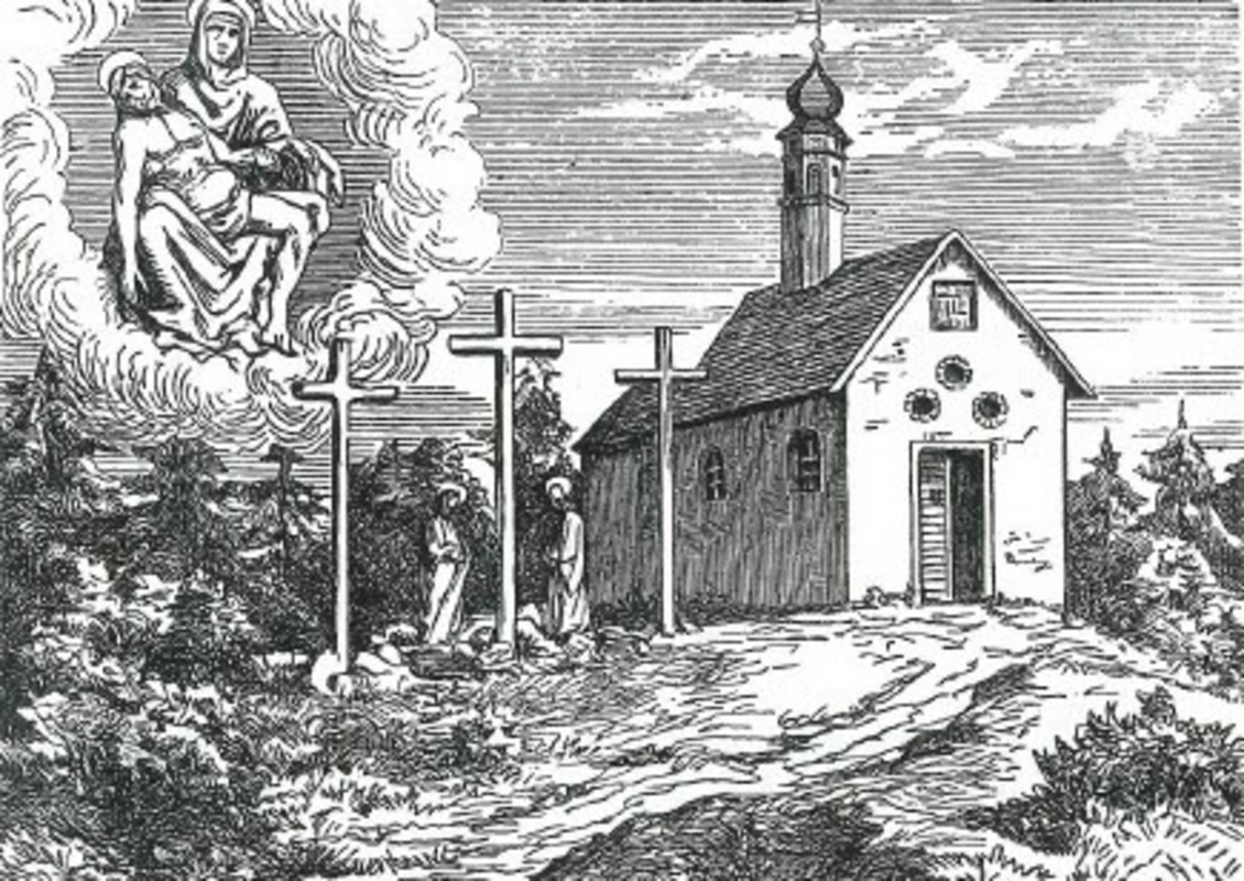 Erfreulicherweise ist dieser Beitrag illustriert mit einem Holzstich; dieser zeigt die Kapelle, das neue Gnadenbild von 1877 und den damaligen, neben der Kapelle gelegenen Kalvarienberg, bestehend aus 3 Kreuzen und 2 Heiligenfiguren. Dieser hat sich leider nicht erhalten.