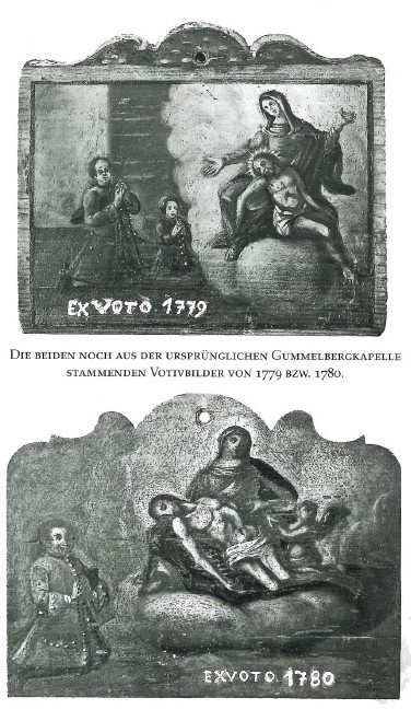 ...Im Jahre 1804 erschien eine allerhöchste Verordnung, dass alle Feldkapellen, vorzüglich solche, welche von den Landstraßen aus gesehen werden können, demolirt werden mussten, und da diese allerhöchste Verordnung allenthalben in Vollzug gesetzt wurde, so mußte auch die Kapelle auf dem Gummelberg mit demolirt werden und das Opfer hörte sodann auf. Das Bildnis der schmerzhaften Muttergottes, welches bei Demolierung dieser Kapelle hätte in die hiesige Pfarrkirche kommen sollen, hat die Gemeinde Pleußen verborgen und behalten. Im Jahre 1816 erschien unvermuthet auf dem Gummelberg auf dem nämlichen Platze wo ehemals die gemauerte Kapelle stand, eine solche mit Brettern verschlagen, welche die Gemeinde Pleußen aufstellte, und das schmerzhafte Muttergottesbild wieder darin aushängte. Sogleich strömten die Leute aus der ganzen Gegend wieder auf den Gummelberg, verrichteten da ihre Andachten und das Opfer, welches anfiehl war nicht unbeträchtlich, besonders wurde diese Wahlfahrt in den Schreckensjahren 1816/17 sehr stark besucht und man war selbst Augenzeuge, daß mehrere Trupps zu 70-80 Personen zusammen kamen und auf verschiedenen Seiten der Kapelle, nachdem selbe den hinlänglichen Raum nicht gewährte, ihre Gebethe und Andachten verrichteten...