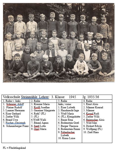 Die beiden Klassenfotos sind um 1920 entstanden. Den sechs- bis achtjährigen Kindern sind die Kriegs- und Nachkriegsleiden und -nöte nahezu ins Gesicht geschrieben, links ihr junger Lehrer Josef Landgraf (geb. 1894), der den 1. Weltkrieg als Soldat und als Kriegsgefangener in Serbien erlebt hatte. Das Foto wurde - wie auch das folgende - dankenswerterweis von der Familie Landgraf/Grzesina überlassen. Josef Landgraf war vom 1.9.1919 bis 31.8.1923 als Lehrer in Steinmühle tätig und wohl auch im Gemeindeleben integriert.