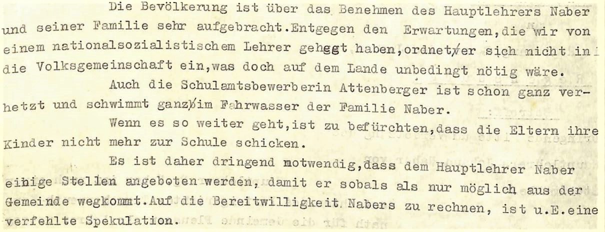 Die Bevölkerung sei sehr aufgebracht, der Lehrer ordne sich nicht in die Volksgemeinschaft ein. Außerdem schwimme eine junge Schulamtsbewerberin schon „ganz im Fahrwasser der Familie Naber“. Es stehe zu befürchten, dass die Eltern ihre Kinder nicht mehr zur Schule schicken. Man solle dem Lehrer einige Stellen anbieten, damit er „sobald als nur möglich aus der Gemeinde wegkommt.“