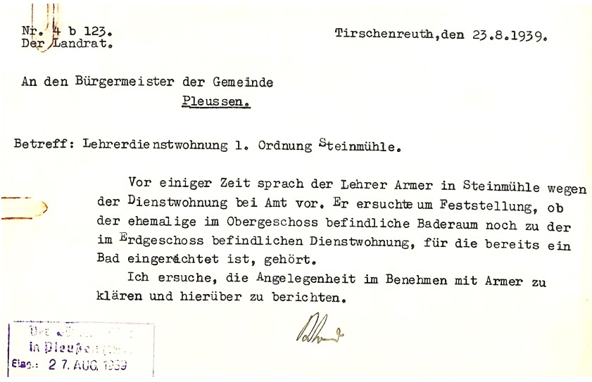 Mit diesem „Gutachten“ der übergeordneten NSDAP-Ebene im Rücken schrieb Ende September 1937 der stellvertretende Bürgermeister über das Bezirksamt Tirschenreuth an die Regierung in Regensburg, Kammer des Inneren, betreffend „Dringende Bitte um Versetzung des Hauptlehrers Johann Naber von Steinmühle“. Ein „Hoheitsträger“, vermutlich der Bürgermeister Karl Sudhoff, habe dem Lehrer die Versetzung kürzlich nahegelegt. Er werde zusagen, so Naber, sobald er „eine ihm passende Stelle“ fände. Die Gemeinde wollte wohl das Verfahren beschleunigen und auch die Umzugskosten übernehmen. Der Kreisamtsleiter des Nationalsozialistischen Lehrerbunds Parteigenosse Hahn werde ebenfalls in der Sache bei der Regierung vorstellig werden.
