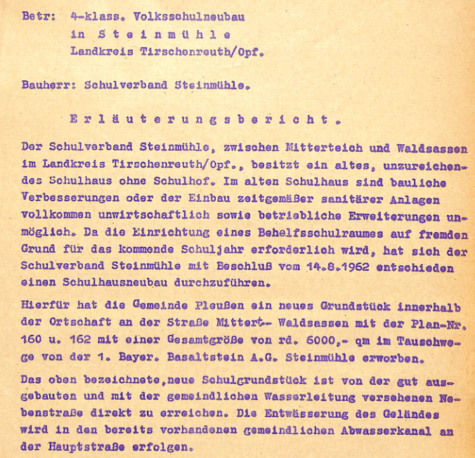Vier bis sechs Kilometer einfach hatten rd. 80 Schulkinder von 6 bis 14 Jahren in den 1880er-Jahren täglich zu bewältigen. Die Dörfer Steinmühle, Pleußen, Hofteich und Gulg gehörten zum Schulsprengel der Schule in Mitterteich. Die steigende Zahl der Kinder erforderte eine andere Lösung. Deswegen wandte sich die Ortsgemeinde Pleußen erstmals am 4. Mai 1885 an die Behörden mit dem Ansinnen, in Steinmühle eine eigene Schule errichten zu können. Mit Hinweis auf das Schulbedarfsgesetz vom 10.11.1861 Art.2 Abs. 4 hieß es in dem Schreiben, es möchte „darauf hingewirkt werden“, eine Schule zu errichten. Der Schulweg würde sich auf rd. 15 Minuten verkürzen. In einem Schreiben an den Magistrat in Mitterteich wurde darauf hingewiesen, dass der Gastwirt (und Gründer der BasaltseinGesellschaft im Jahr 1880) Josef Wiendl aus Mitterteich eintausend Mark zum Bau der Schule beisteuern würde, ebenso würde er den Grund unentgeltlich zur Verfügung stellen. Die Überfüllung der Schule in Mitterteich wurde ebenfalls als Argument ins Feld geführt. Das Ansinnen blieb ungehört.