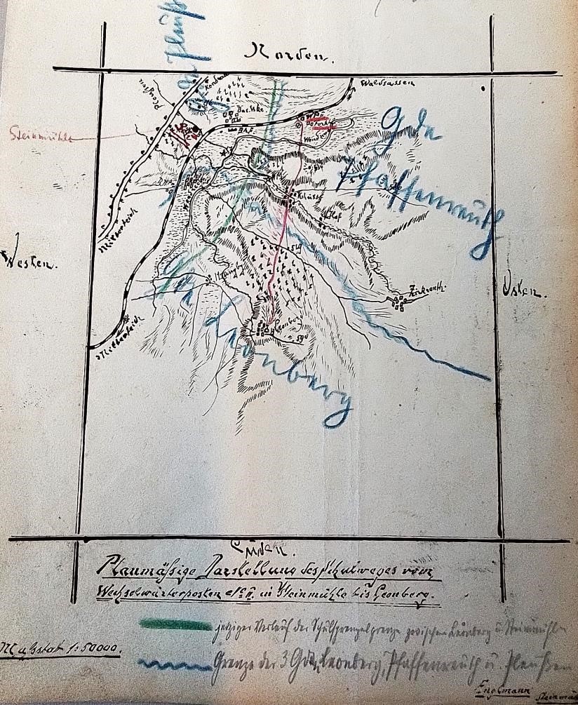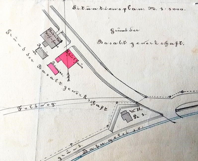 Zu erkennen ist, dass zwar das „Arbeiterhaus“ der Basaltstein AG schon besteht, aber erst später manche Änderung im Umfeld dazu kam. So führte der Weg nach Königshütte noch ebenerdig über die Bahngleise – am Bahnwärterhaus Posten 1 vorbei. Die Bahnüberführung mit Brücke kam wenige Jahre danach, ebenso entstand das „Bahnererhaus“ mit Wohnungen und Dienstzimmern an dieser Überführung. Der Feldweg nach Terschnitz/Hofteich wurde später an die Nordseite des Arbeiterhauses umgelegt und ausgebaut (heute an der Kirche vorbei).