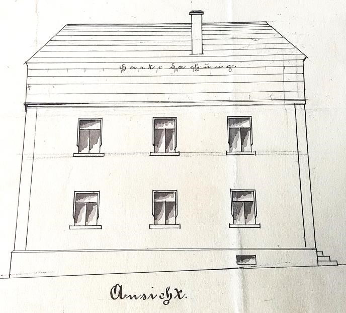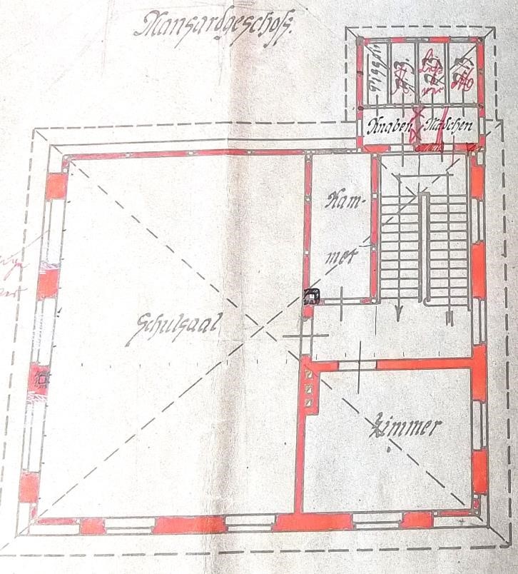 Der Plan für das „Mansardgeschoß“ sah neben dem Schulsaal auch ein Zimmer für einen unverheirateten Lehrer vor.