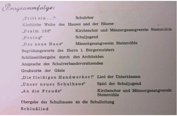 Die Schule dürfte in den allermeisten Fällen zudem ihrer Aufgabe gerecht geworden sein, die Kinder und jungen Leuten durch die verschiedenen Phasen ihrer persönlichen Entwicklung begleitet zu haben. Ob und wie im Einzelfall Bildung und Erziehung, die Hinführung auf Beruf und Leben gelangen oder auch eine weitergehende individuelle Förderung einzelnen jungen Leuten weitere Chancen eröffnete, ist naturgemäß nicht generell zu beurteilen. Auch wenn er nicht messbar ist: Unbestreitbar hoch dürfte der Beitrag von Schule und Lehrkräften zum Gemeinschaftsleben in der Gemeinde gewesen sein. Kleines kulturelles und soziales Zentrum im Mikrokosmos der Gemeinde war die „Dorfschule Steinmühle“ in diesen sieben Jahrzehnten allemal.