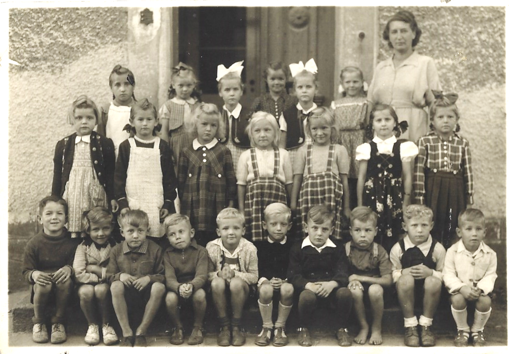 Vielleicht kann uns auch jemand die Namen der Schülerinnen und Schüler auf dem folgenden Foto nennen? Ihre Geburtsjahre dürften in den letzten Kriegsjahren liegen oder kurz danach. Schulleiter Karl Rudofksy ging im Jahr 1958 an eine Schule in Regensburg, seine Frau unterrichtete noch in Mitterteich.