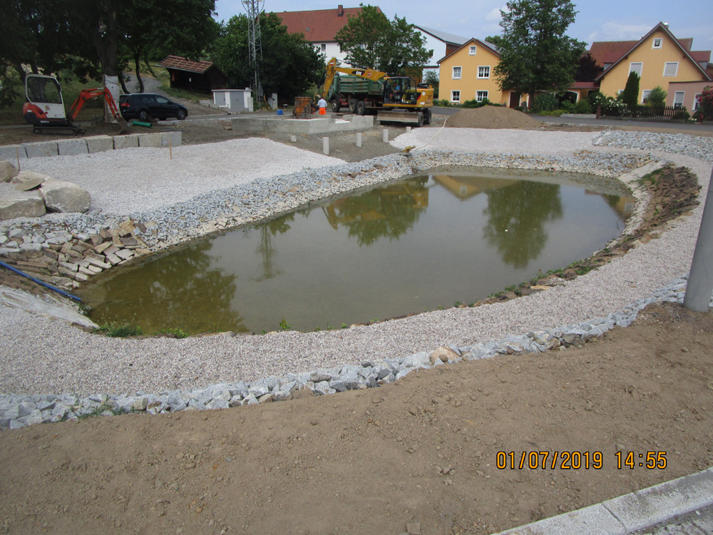 Bild: Ein neuer Teich. Im Hintergrund sind Häuser zu sehen.