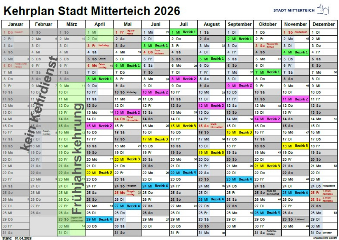 Der Kehrplan pausiert während den Wintermonaten, bei winterlichen Straßenverhältnissen und bei Straßenbauarbeiten.