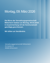 Die Büros der Verwaltungsgemeinschaft Mitterteich bleiben am Montag, 09. März 2026 in Zusammenhang mit der Kommunalwahl ganztägig geschlossen. Wir bitten um Verständnis.